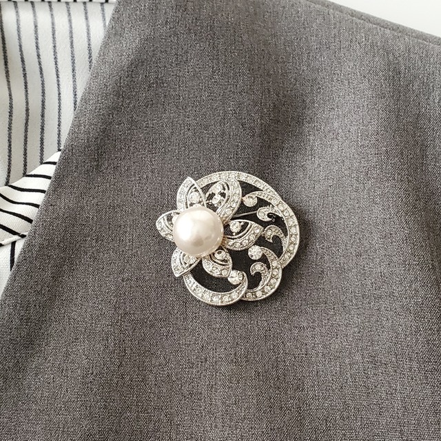 中央に艶やかなパールを配し、繊細な透かし模様とラインストーンが美しく調和したシルバーカラーブローチ。クラシカルで上品なデザインは、卒業式・入学式・式典・フォーマルシーンはもちろん、ジャケットやワンピースに添えて日常の装いを格上げします。大人の女性に似合う華やかさと品格を兼ね備えた一品 MZL-12