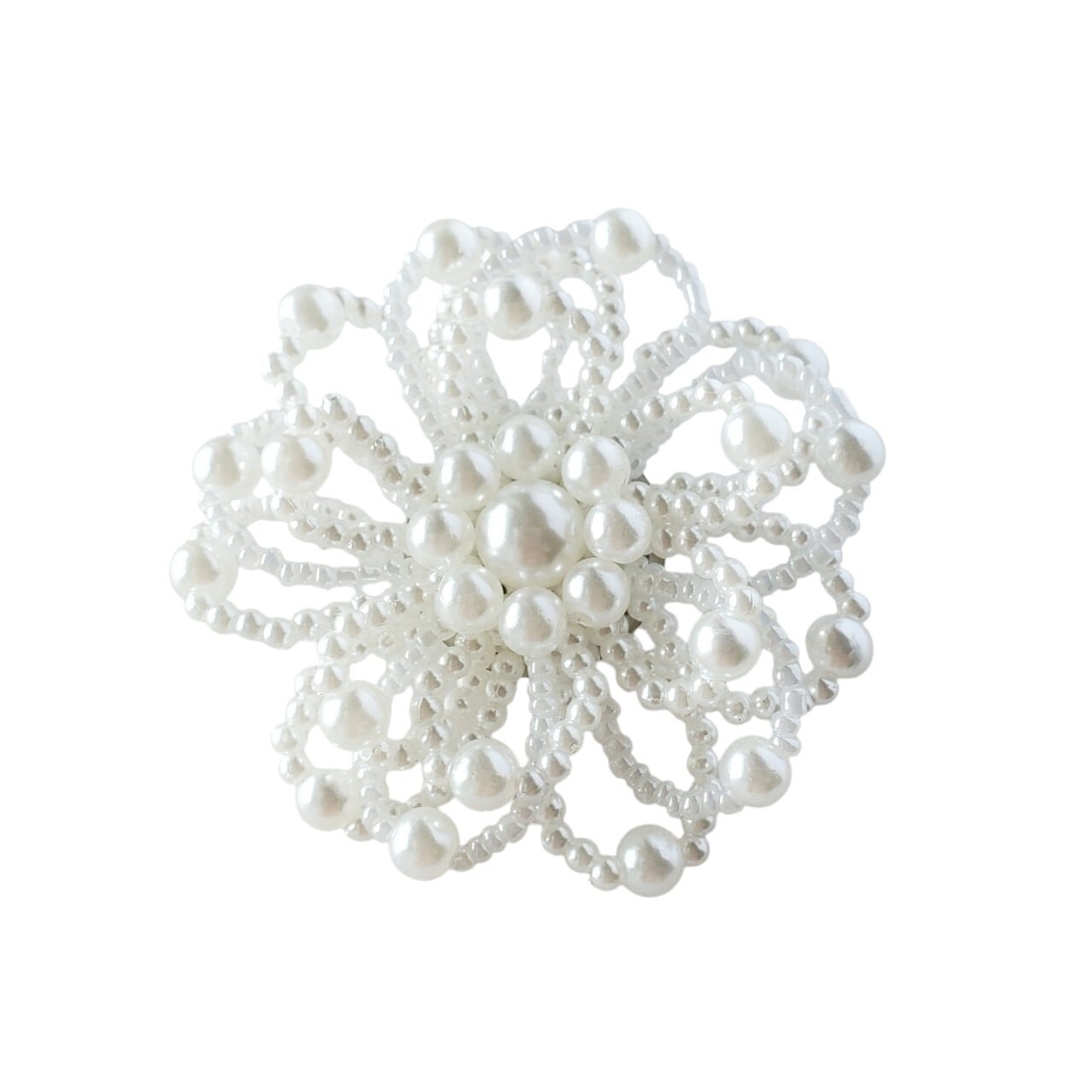 小粒パールと大粒パールを組み合わせ、花が咲いたような立体感を表現したパールブローチです。