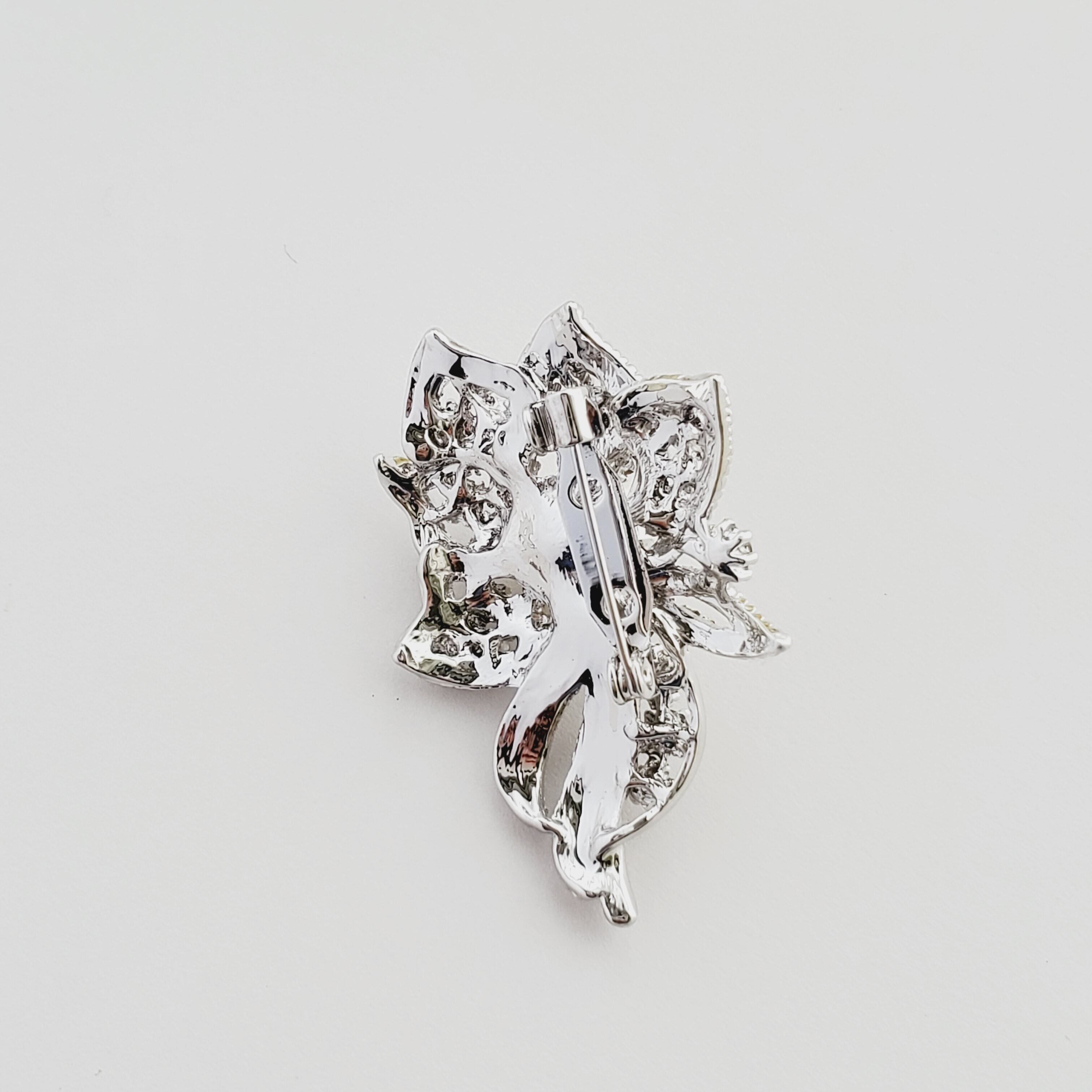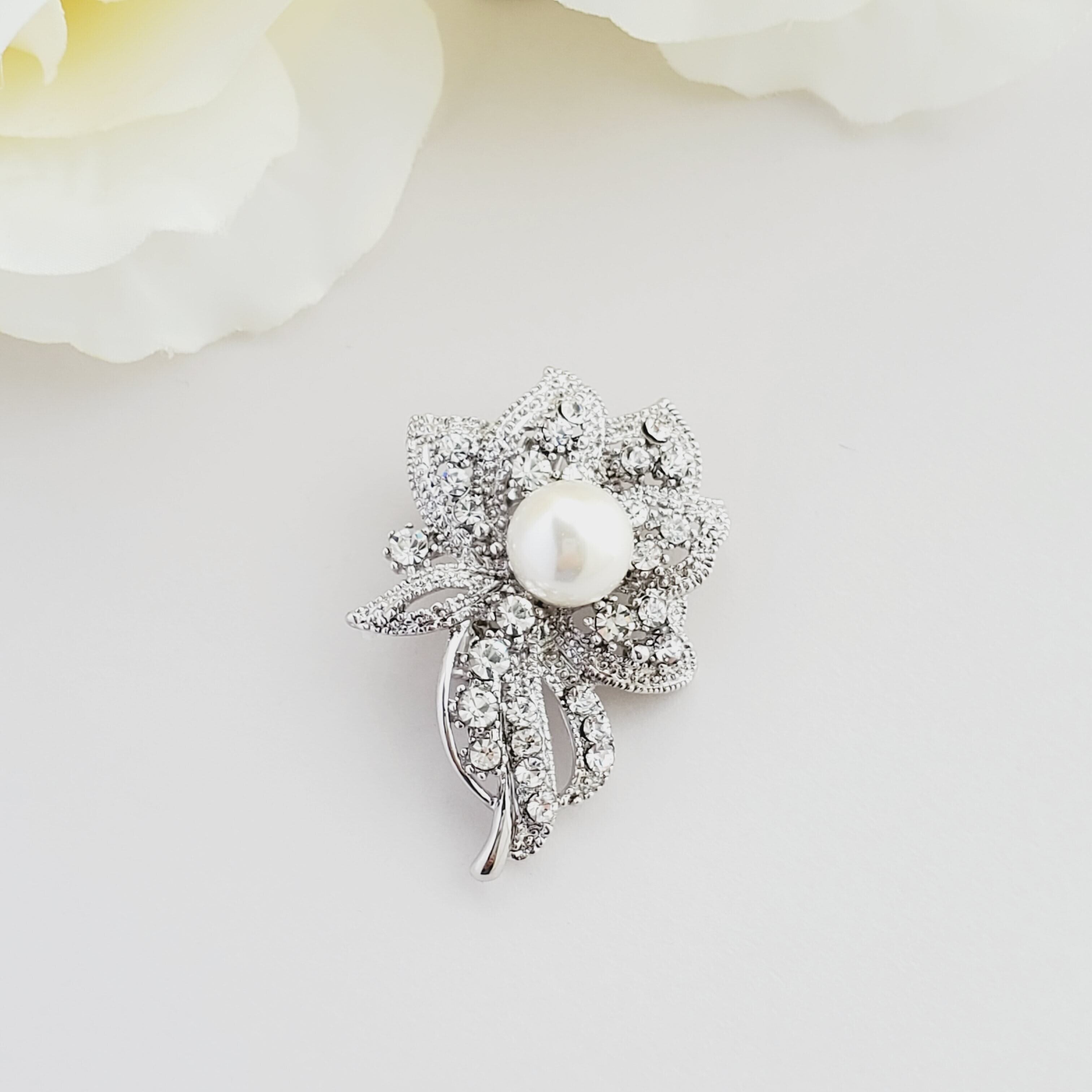 中央に存在感のある10mmパールをあしらい、花モチーフ全体に繊細なラインストーンを敷き詰めた、小ぶりの上品で華やかなパールブローチです。