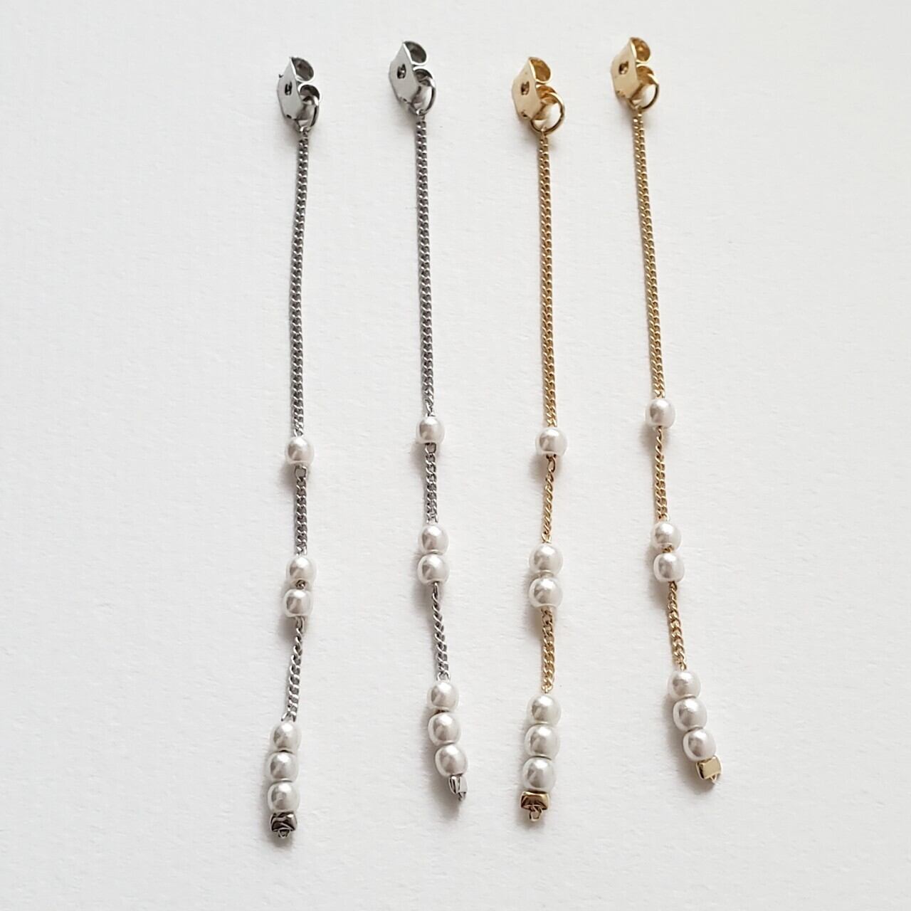 シンプルなスタッドピアスに装着することで、揺れるロングデザインになり、さりげなく華やかな耳元を演出します。