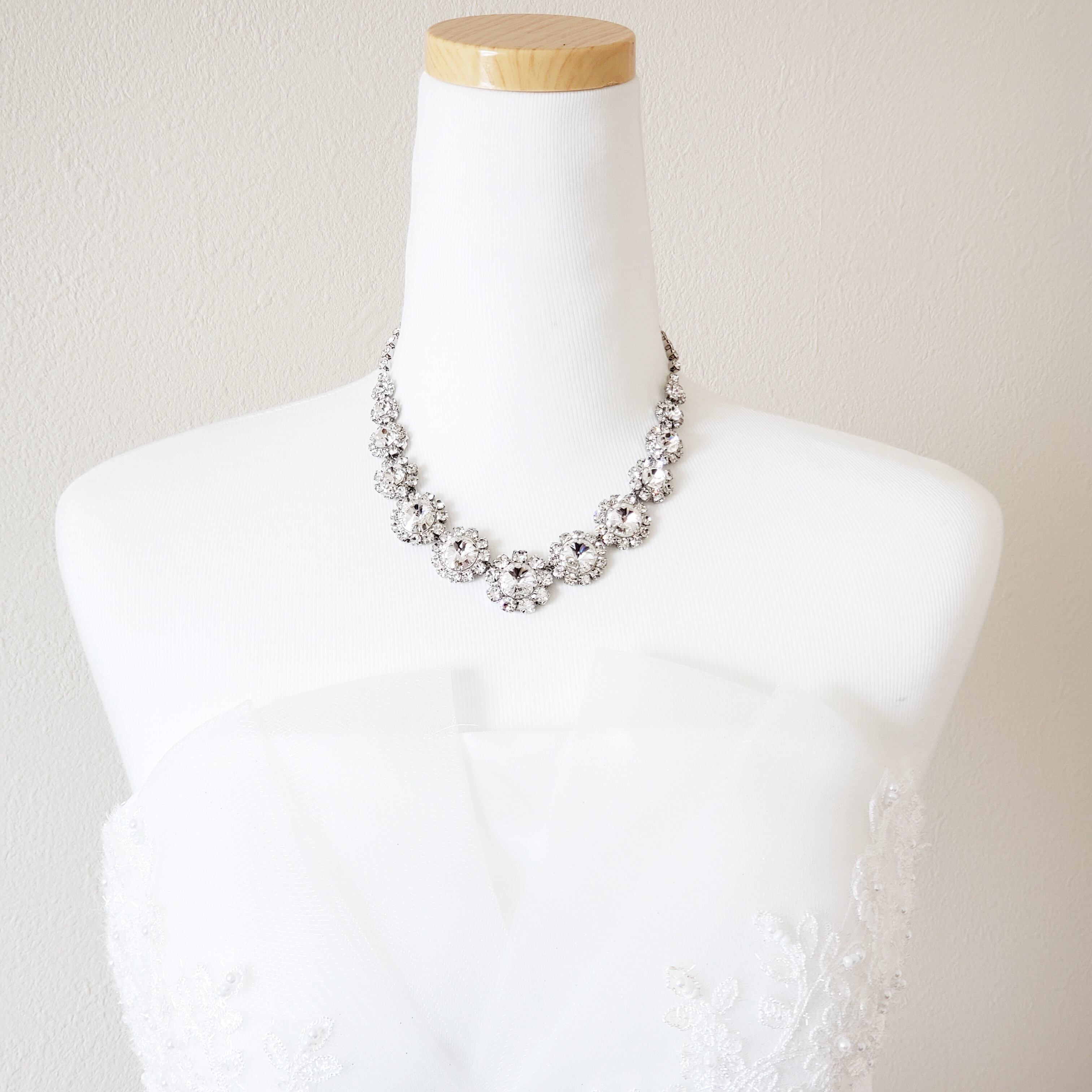 大粒のクリスタルを花モチーフにデザインし、首元と耳元をエレガントに彩ります。