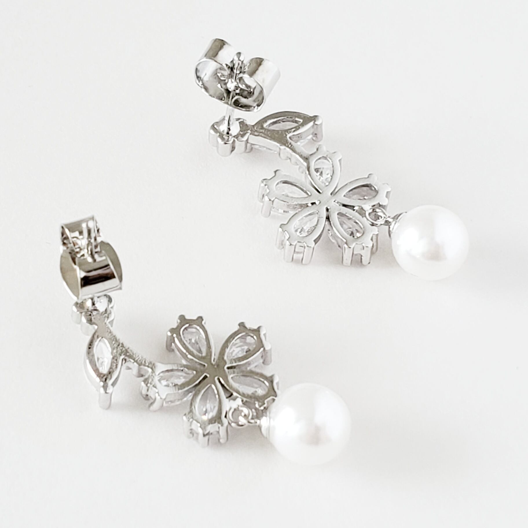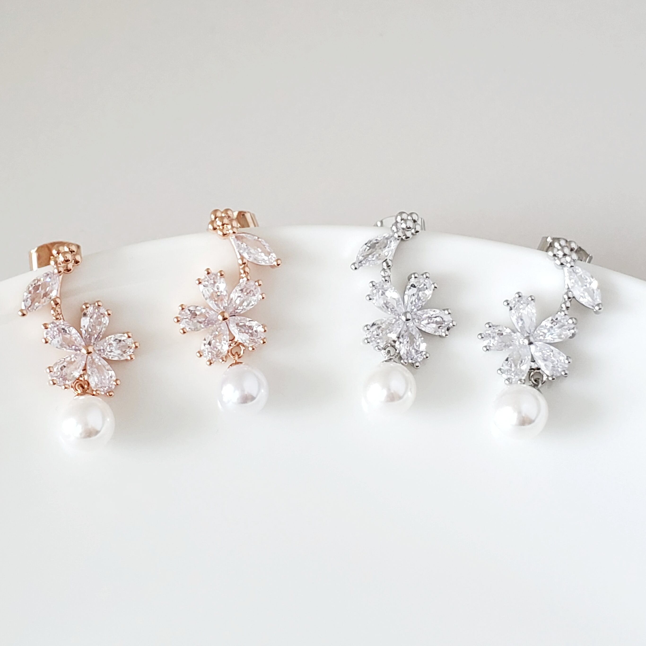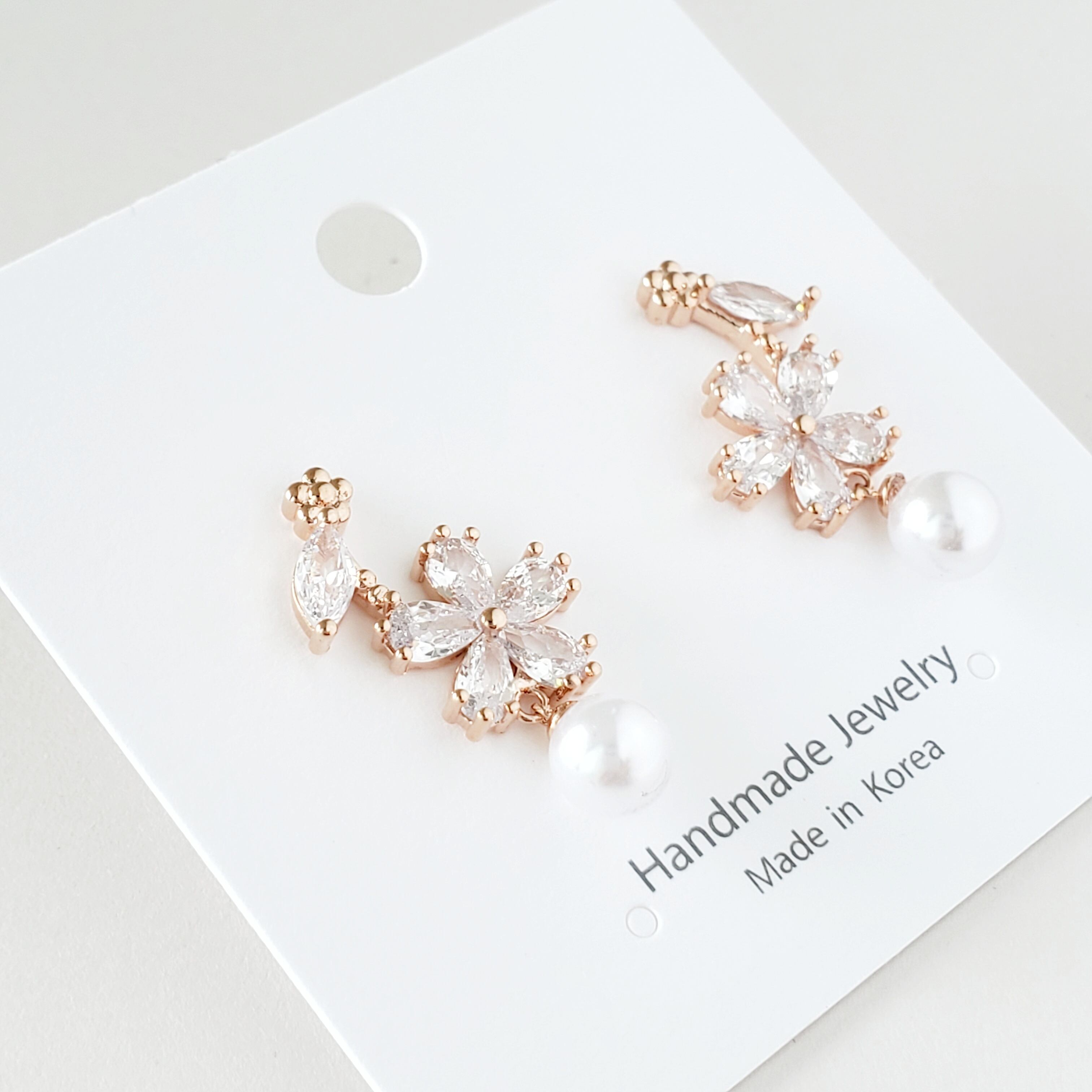 繊細なフラワーモチーフにきらめくキュービックジルコニアを贅沢にあしらい、揺れるパールが上品さをプラスした華やかなピアスです。