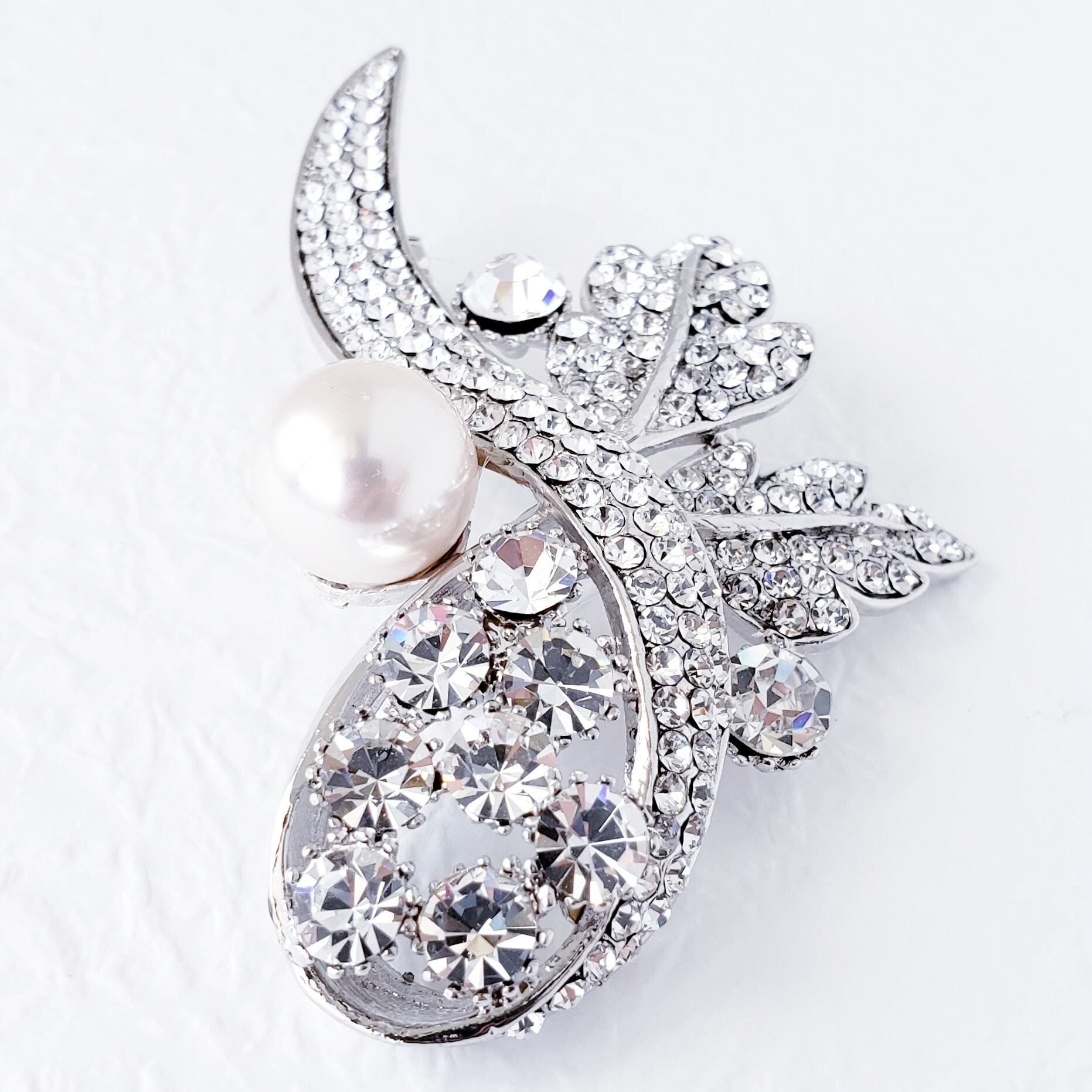 艶やかなパールと繊細なラインストーンを組み合わせた、セレモニーシーンにふさわしい上品なブローチです。