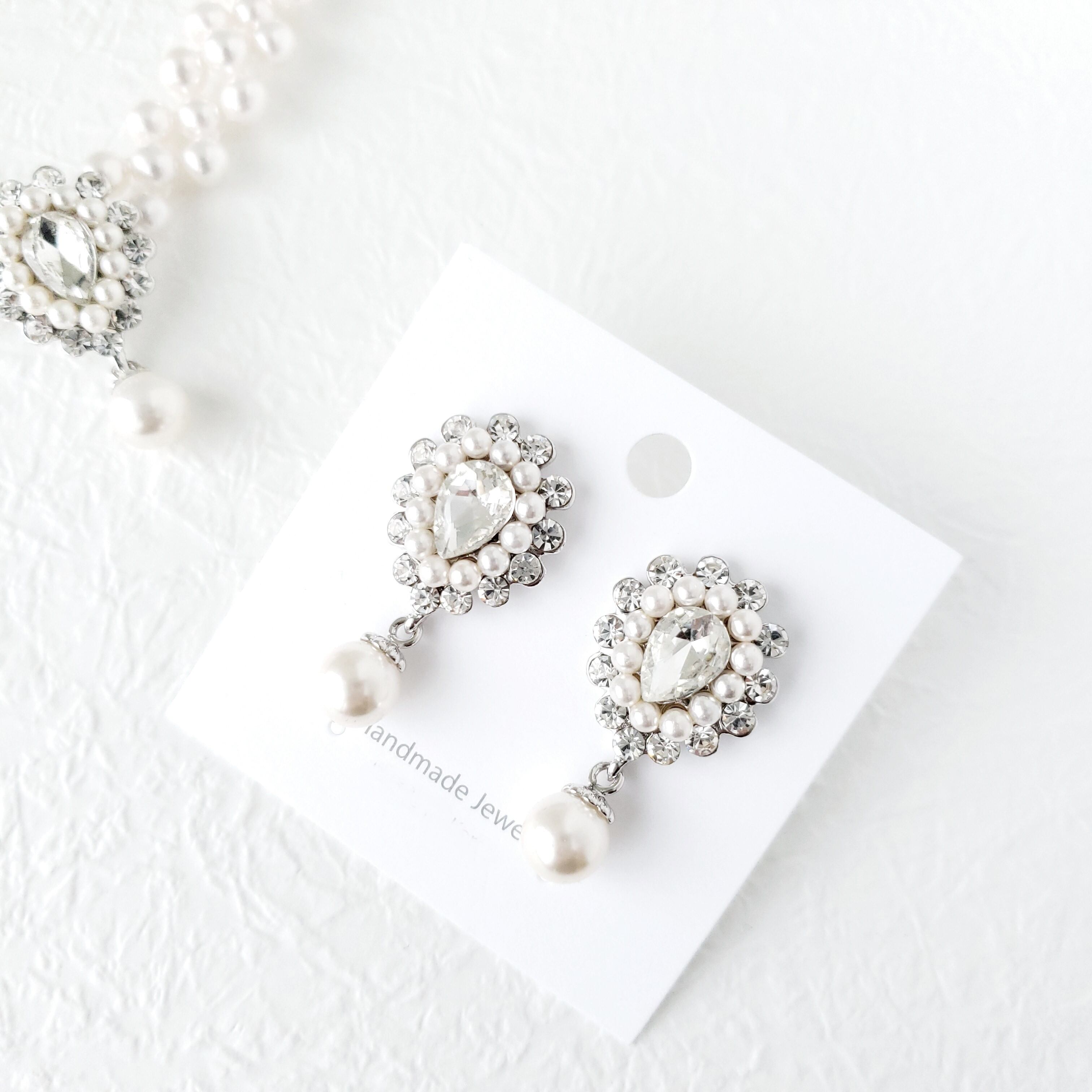 上品な輝きが耳元を華やかに彩る、パールとラインストーンのビジューピアスです。
