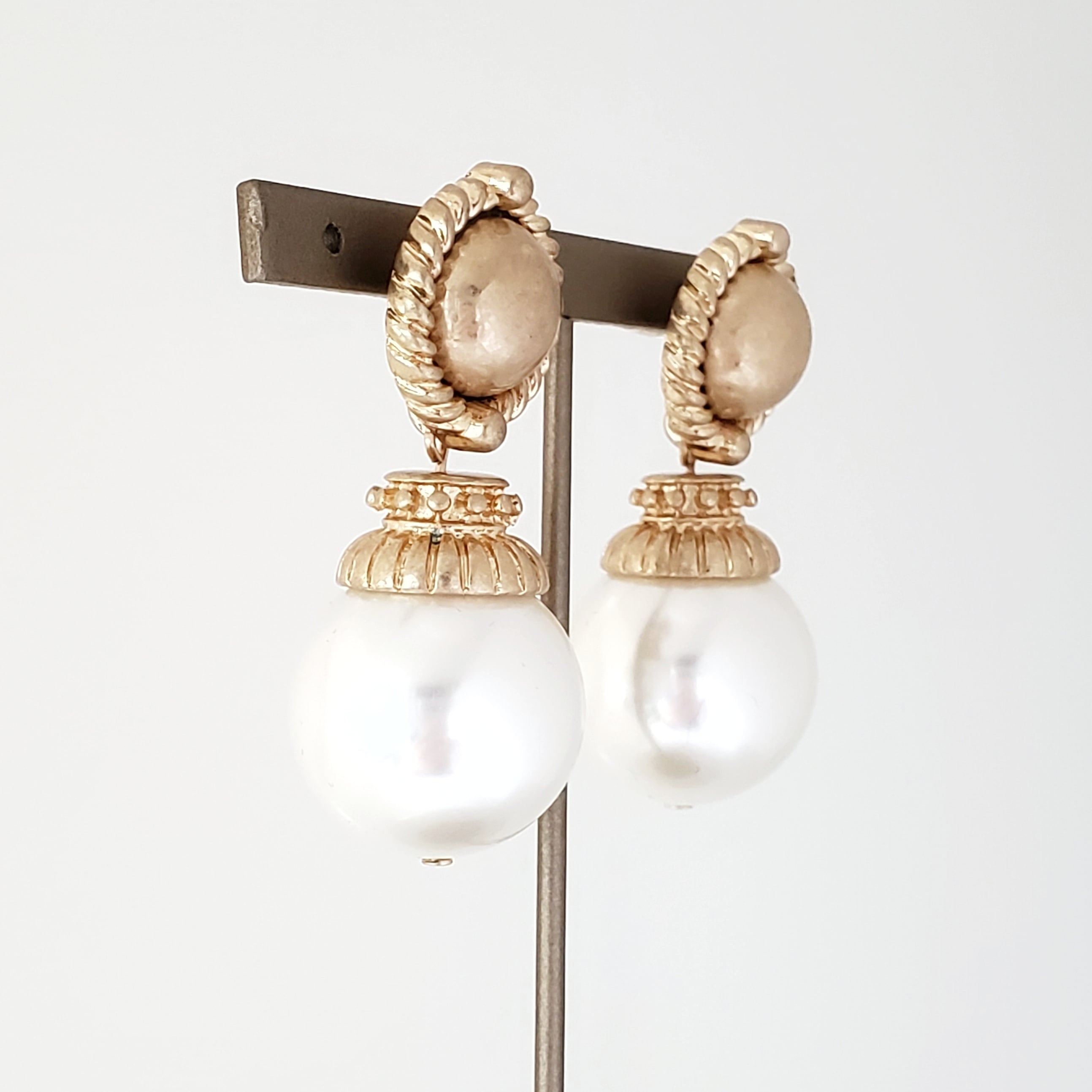 アンティーク仕上げのゴールドモチーフとビックパールのピアスです。