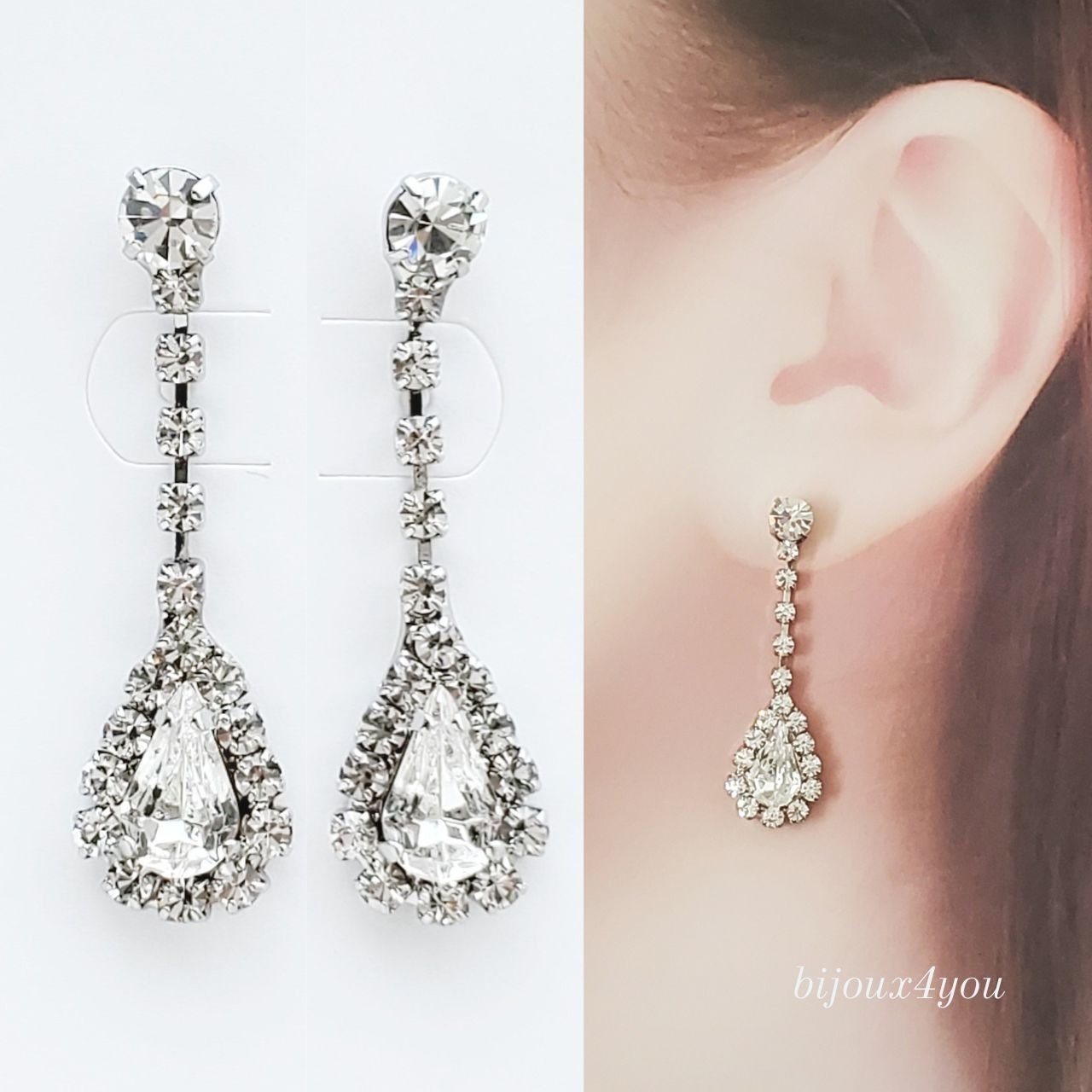 大粒のクリスタルが光を受けるたびに美しく煌めき、耳元を華やかに演出。しずくの周囲には繊細なラインストーンが敷き詰められており、角度によって異なる輝きを見せる上品なデザインです。