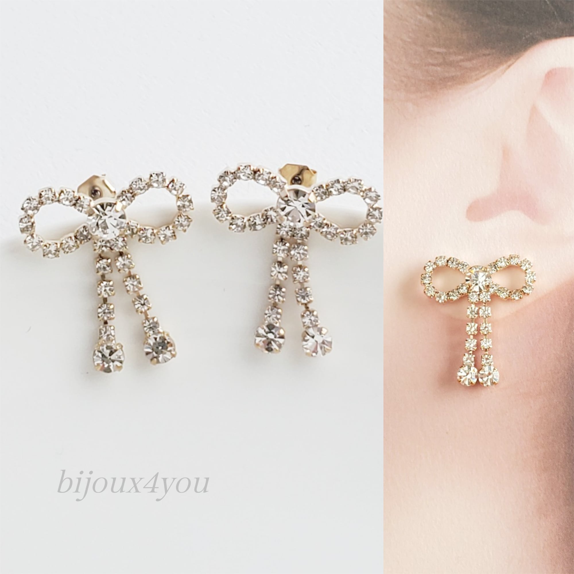 女性らしさを引き立てる可憐なリボンモチーフのラインストーンピアスまたはイヤリングです。